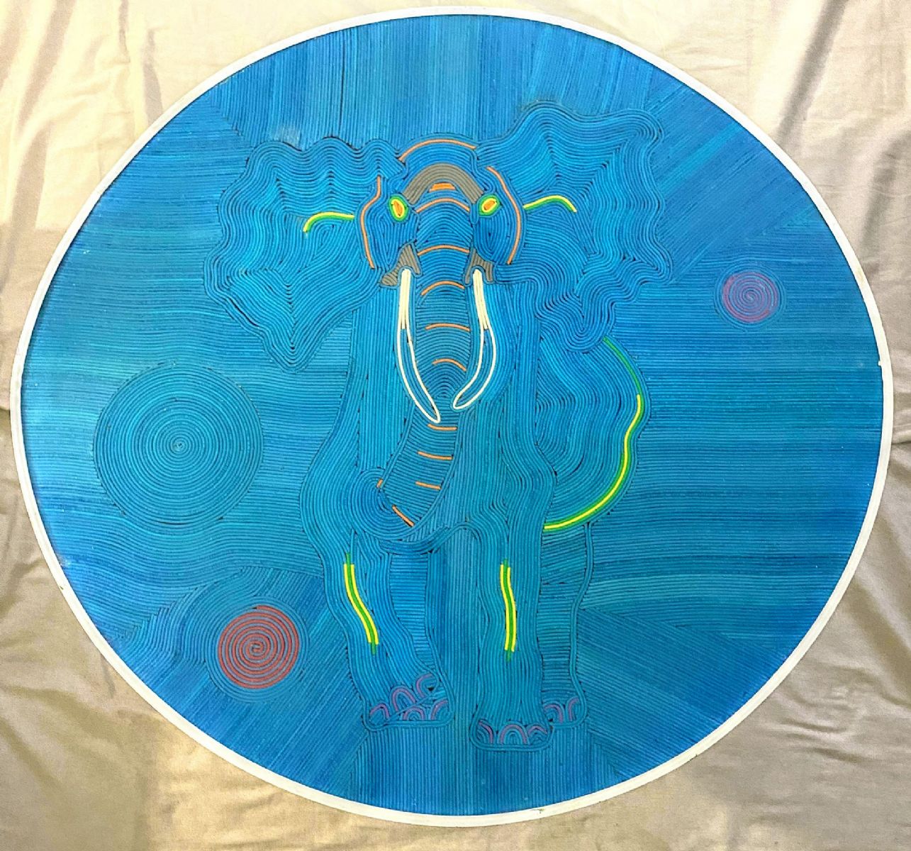 This is an art piece I constructed with coax transmission cable wire, masonite board and plywood. Because my original concept was a coffee table, it's constructed to be sturdy and durable. The construction process started off with a large piece of masonite board and plywood for the base. I then drew out the image on the wood and followed that as a guide to glue and staple individual cut pieces of coax transmission cable wire. In my final step, I sealed it with an epoxy resin overlay. I was able to construct this piece with mostly recycled materials. The end result is "The Electric Elephant". It's a little loud, a lot to look at, and always the elephant in the room.