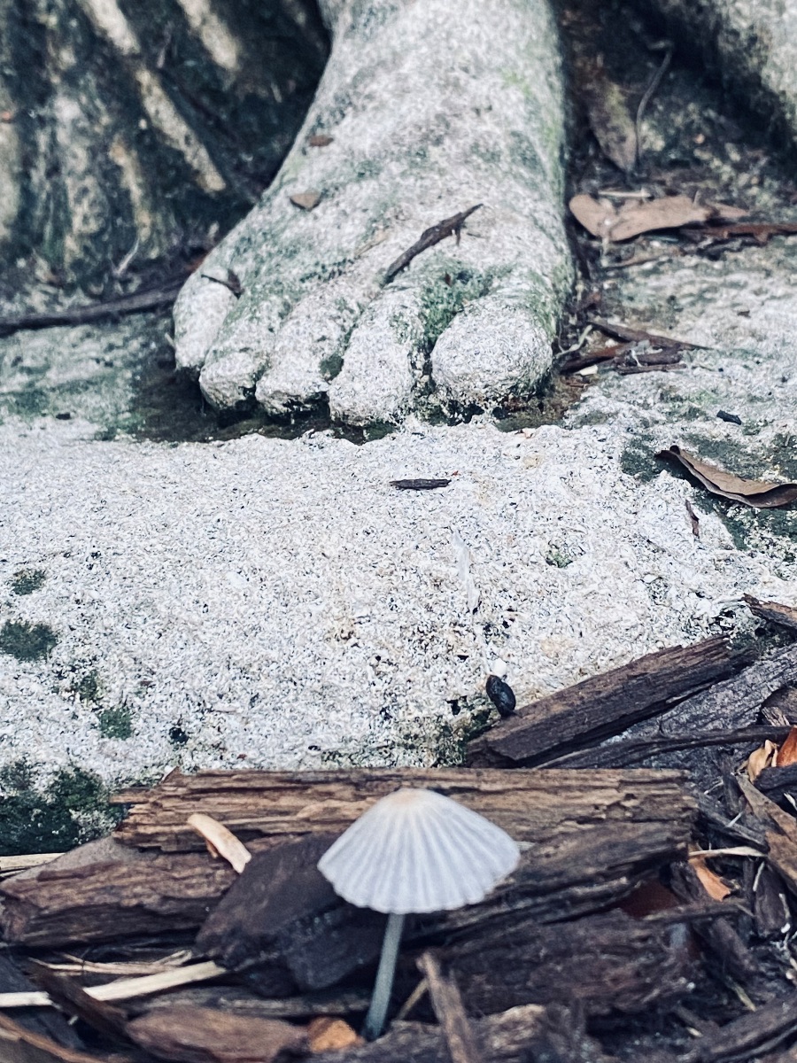 An umbrella mushroom under a foot somehow makes a dull day glow.