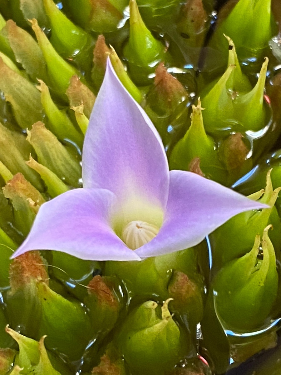 Deep from inside an overgrown plant, rises a tiny, vibrant flower.
