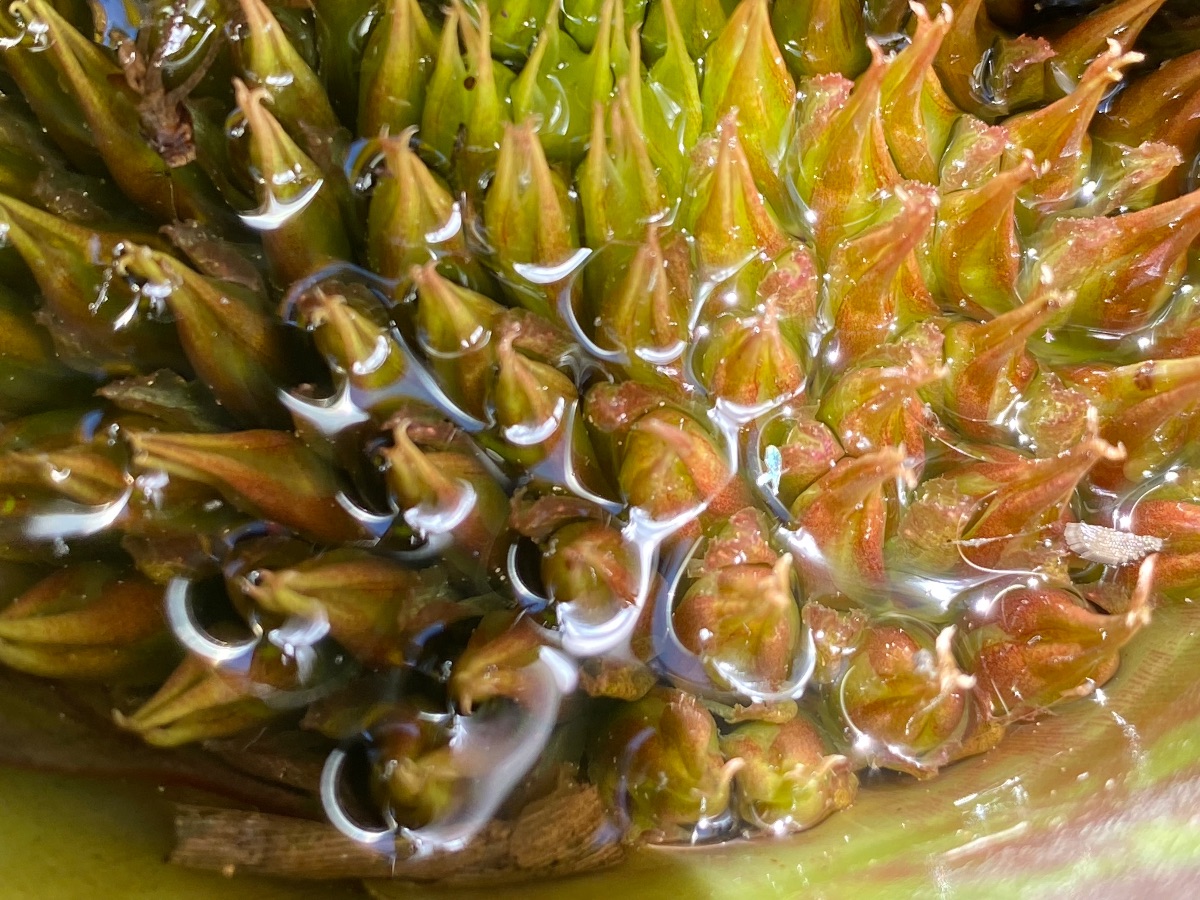 What am I? Thorns? A pineapple? No. I am the center of a Bromeliad plant.