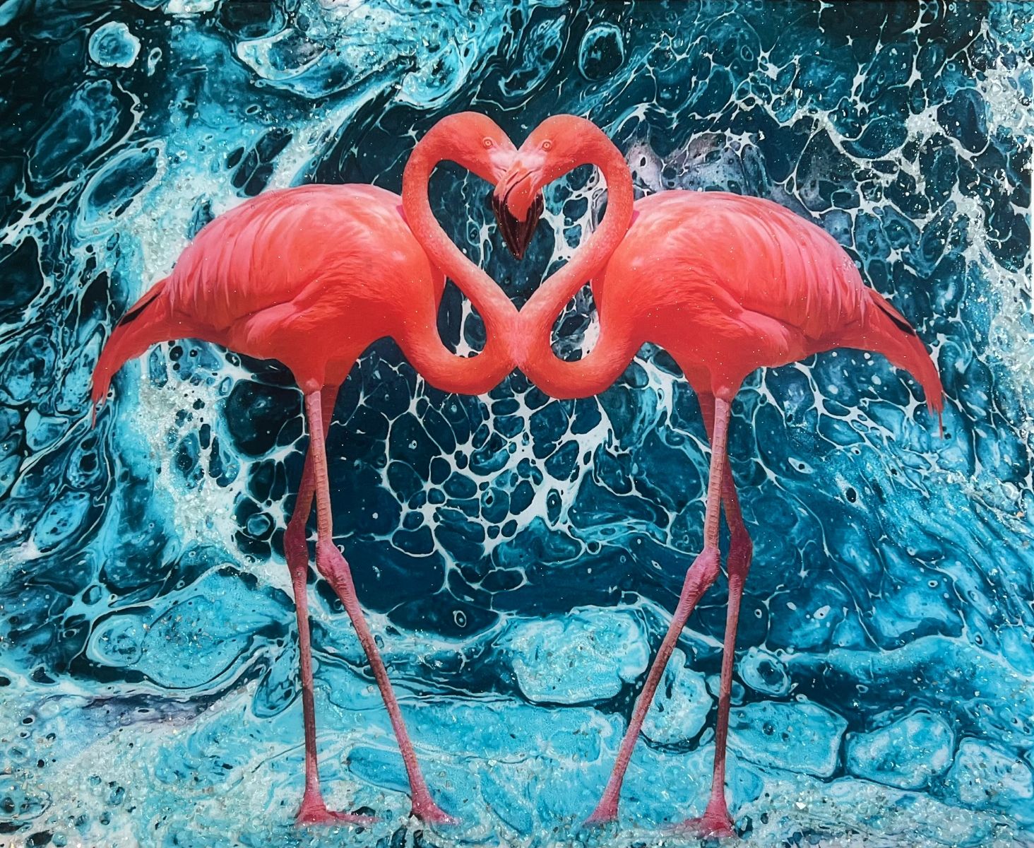 Flamingos' Amore captures the tender love between two flamingos, symbolizing unity and affection. With soft hues and intertwining necks forming a heart, it invites viewers to cherish their own connections and celebrate the beauty of love and nature.