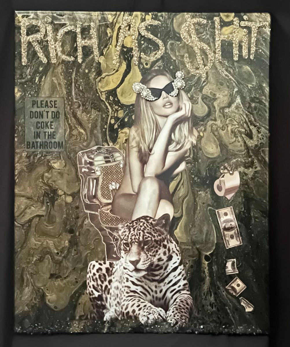 "Rich as Shit" explores the juxtaposition of wealth and celebrity culture, inviting viewers to contemplate the absurdity of excess. By placing the iconic Brigitte Bardot on a gold-plated toilet, alongside a leopard and money as toilet paper, this artwork challenges society's obsession with opulence and the commodification of fame. It serves as a satirical commentary on the extravagance of our times, prompting reflection on the values we hold and the lengths to which some go to attain perceived success.