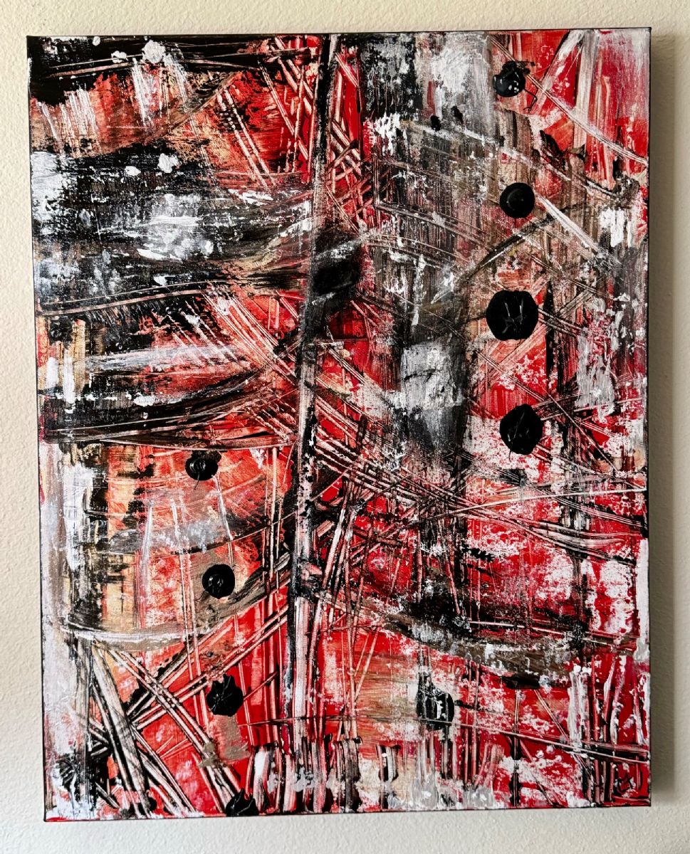 As I was painting, I used a piece of gutter material to express the layers of pain, stress, anxiety, frustration and relief.