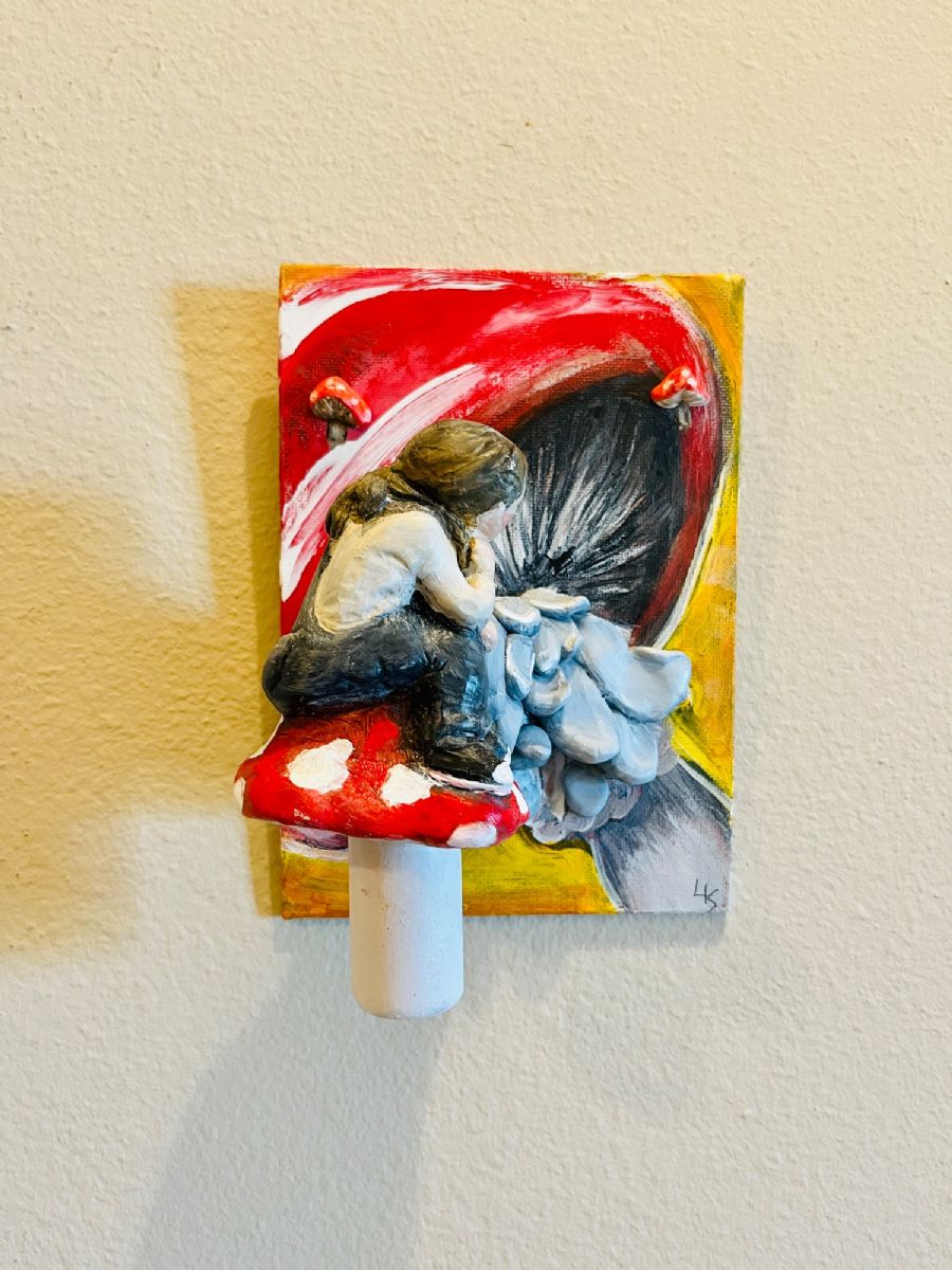 Sitting among the mushrooms meditating life's mysteries. This artwork can be used as a jewelry hanger or just enjoyed as a unique piece of art. It is a combination of epoxy clay and acrylic on canvas.