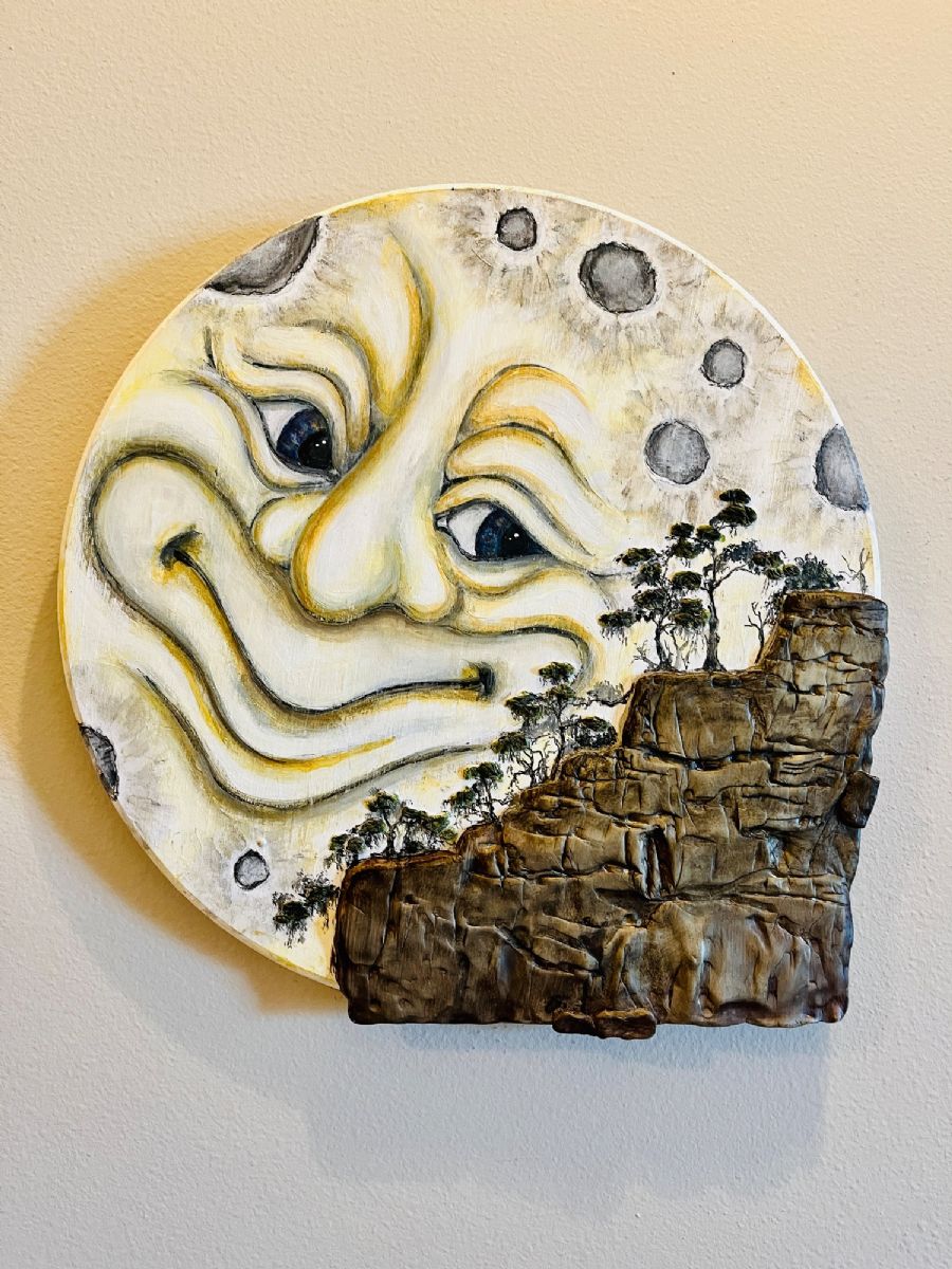 This smiling moon is painted on a wood panel. He overlooks the trees that grow on a rocky cliff. The textured cliff is constructed from epoxy clay.