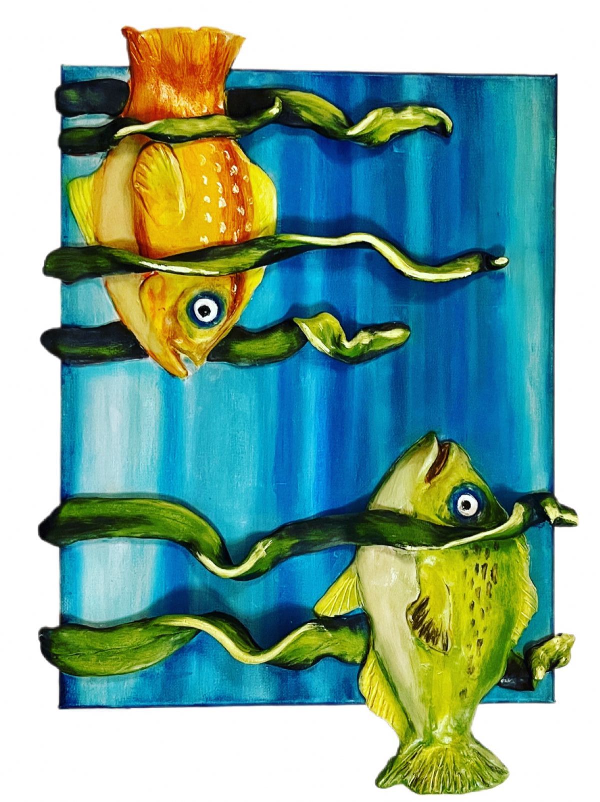 This brightly colored piece combines 3 dimensional fish and sea grass with the backdrop of crystal blue water. This piece combines epoxy clay with an acrylic painted canvas.