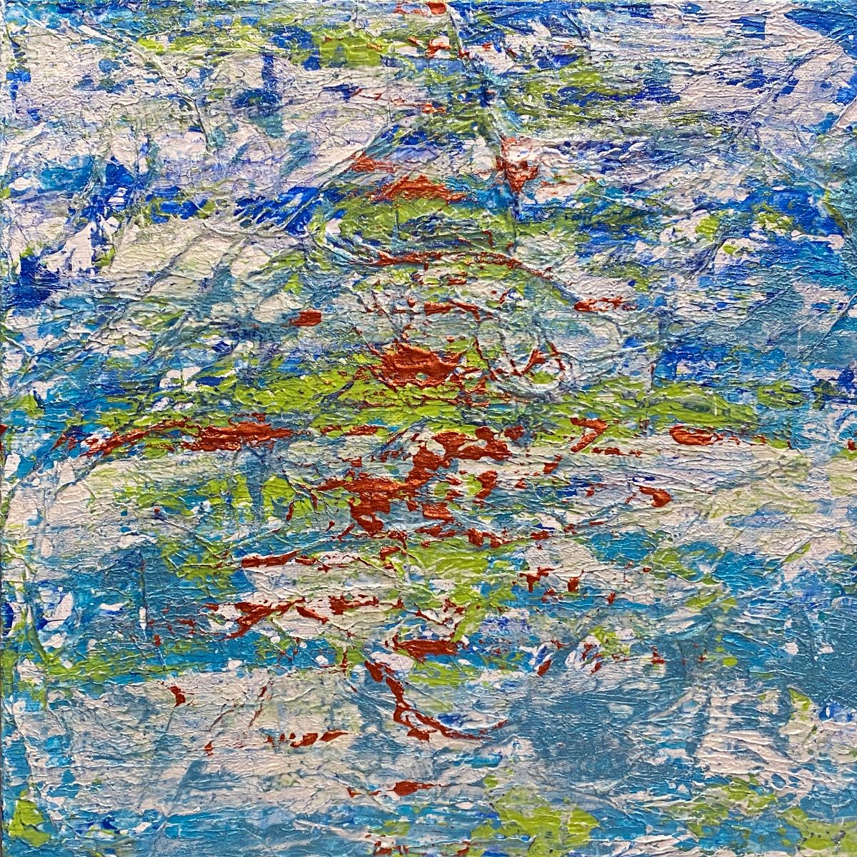 Starting with a base texture of paper applied to canvas, then layers of acrylic colors. Final layer of an acrylic copper.All together creating an abstract that evokes the feel summer sun perhaps reflecting off the water.