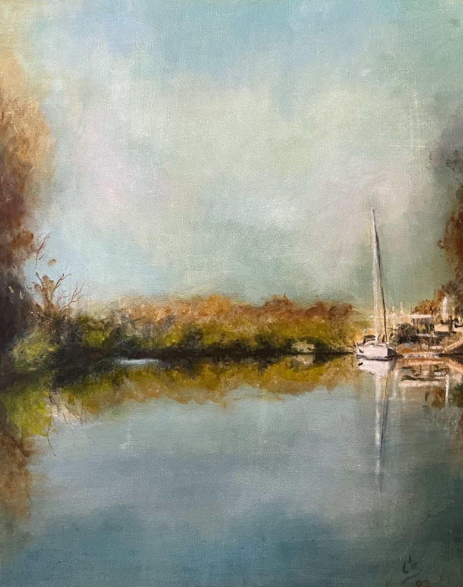 I love the serenity of sailboats, no matter where they are. This particular one was docked near my condo. The air was still and the water was flat. I altered the colors from the original reference photo. I felt the muted colors better conveyed the peacefulness of the setting.