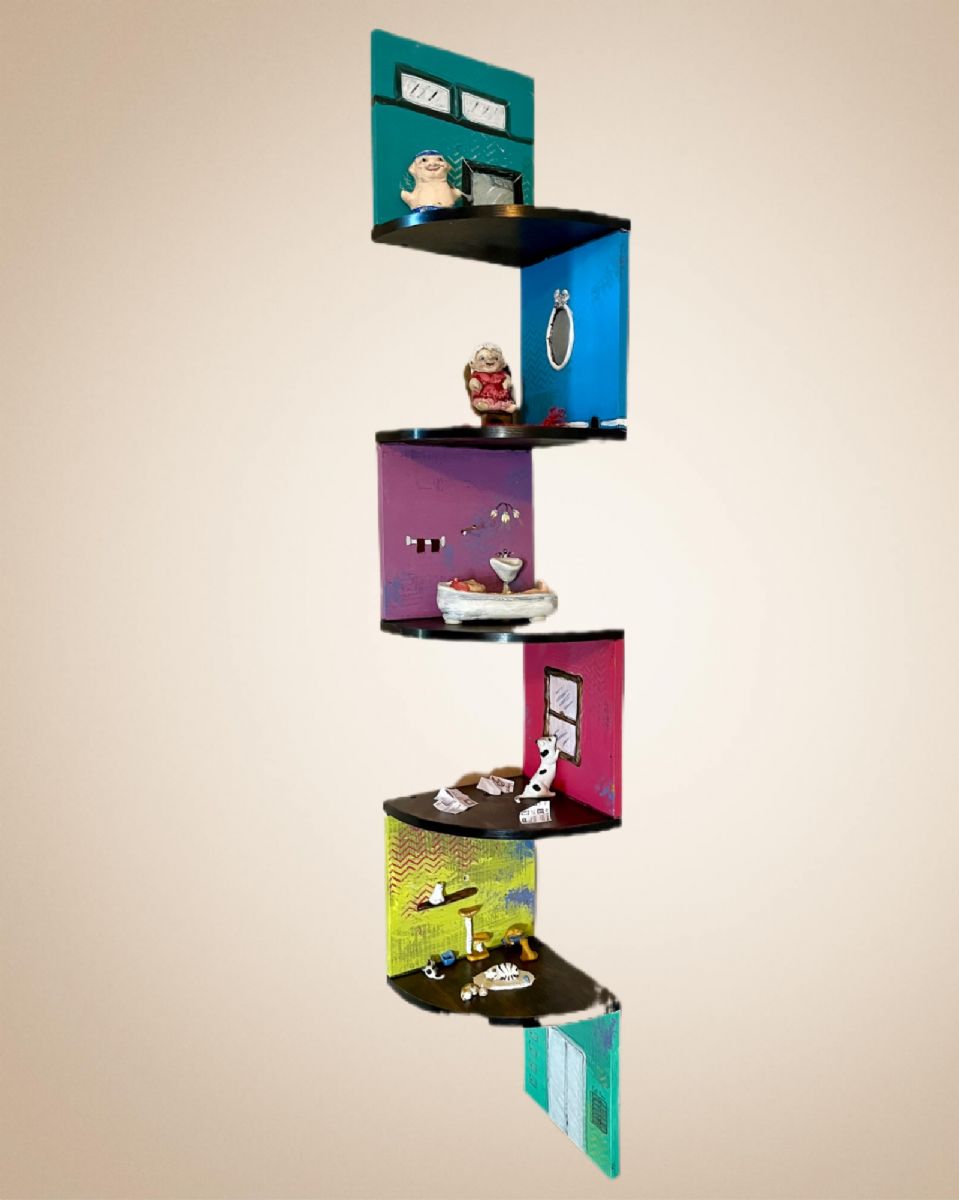 Condo living was so much fun to create, especially since I live in a condo! I used epoxy clay for the residents and made them with humorous features to add to their character. Let's face it, in a condo, there are a lot of characters. My favorite floor is the one where the dog has destroyed the apartment and is waiting by the window for his "person". Lots of little details and fun colors make this piece unique and interesting.