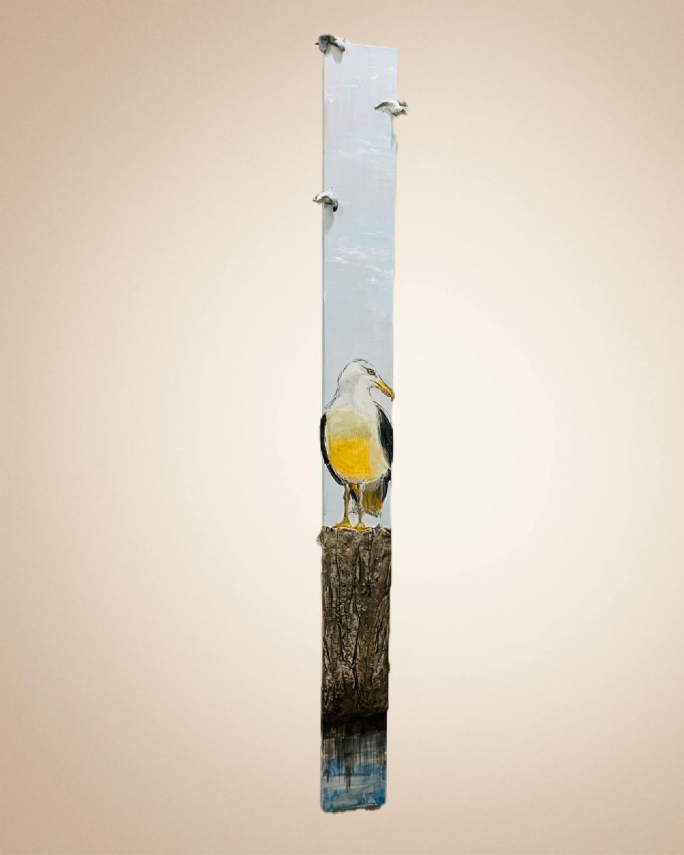 The mixed media piece combines epoxy clay and acrylic paint on a wood plank. It's fun and funky for any Florida decor.