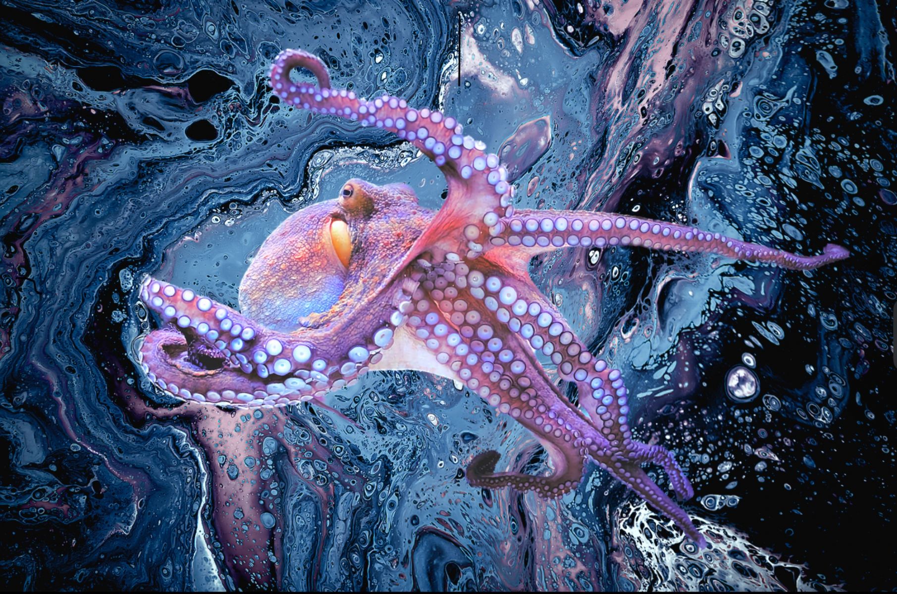 In this mixed media piece, the octopus comes to life through the dynamic fusion of an acrylic pour printed on canvas, glass elements creating depth, and a glossy resin finish. This layered approach aims to capture the fluidity and complexity of the creature, inviting viewers to explore the interplay of color, texture, and dimension within the artwork. The use of diverse materials reflects the diverse nature of the ocean, allowing the octopus to emerge as a vibrant, multidimensional entity.