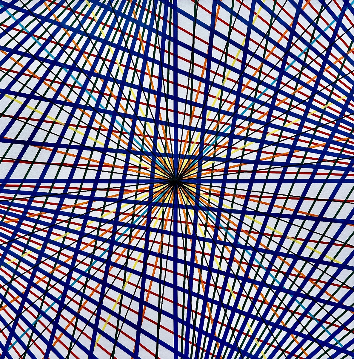 I have always been fascinated by overlapping patterns of lines. They can pull the eye in different directions and combine to create unexpected effects. Here I used a variety of dominating and more subtle lines and colors to create several fields toward and through which the eye is drawn. The colored lines meeting at the center of the piece fan out like beacons, shining behind and through the blue grid.