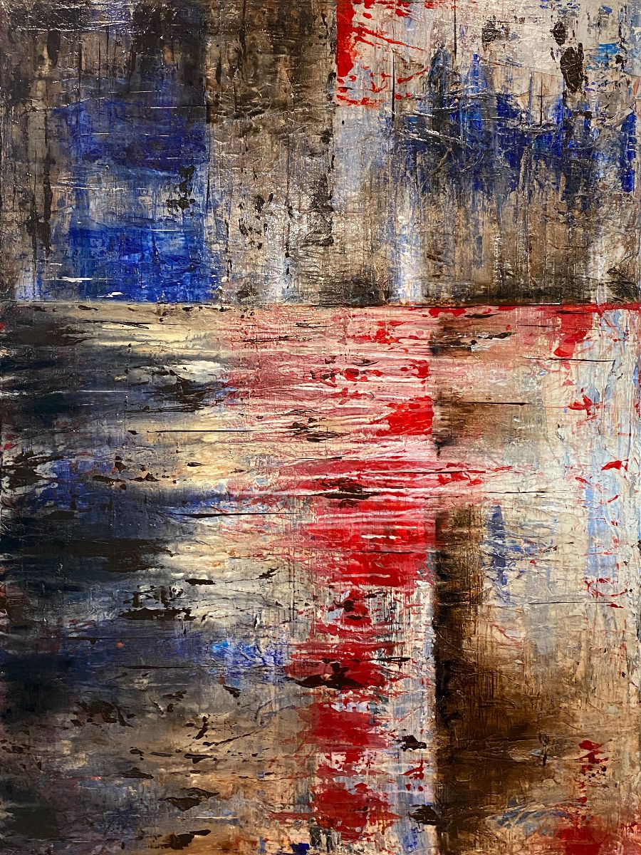 Several different views in one work, Urban Reflections gives an Americana cityscape during a stormy day. Possible buildings, adverts, or energies reflect in the watery lower part of the painting. Acrylics over a base layer of paper applied to the canvas create a unique texture to add more dimension.