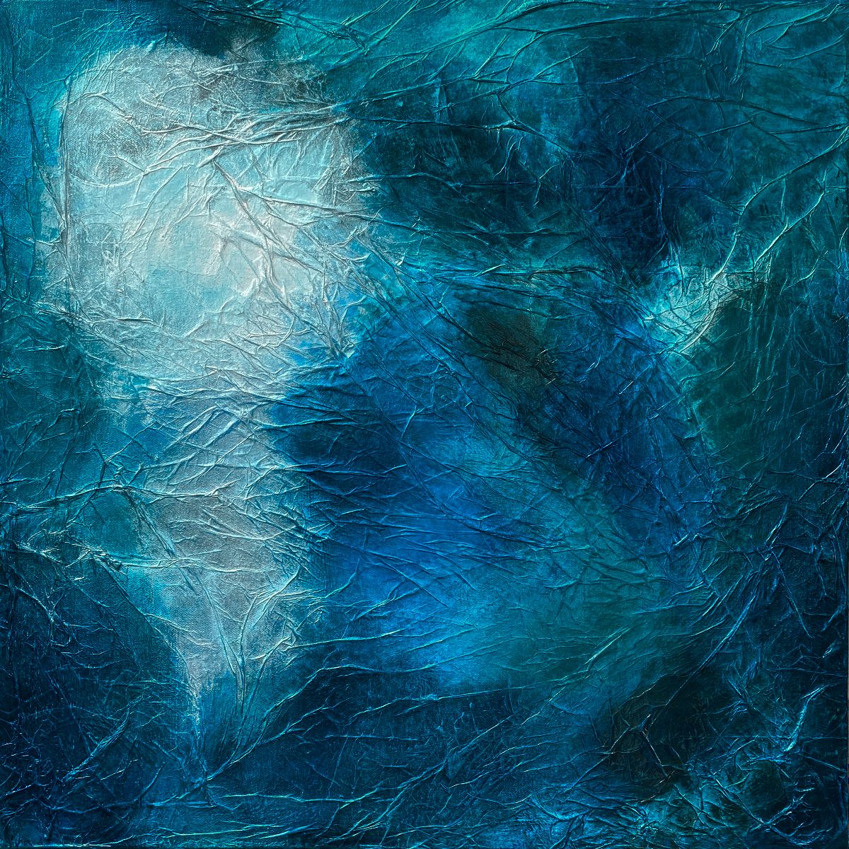 Various blues and a shimmering mica powder create a deep, inviting painting. The added texture of paper gives even more depth. Evoking ethereal, cosmic, or even icy feelings.
