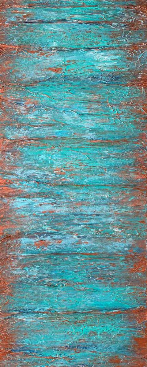 A strong play on copper and its patina evolution. Starting with a heavy layering of paper as a textural base. Layers of acrylic copper tones are topped with various hues for blues and greens to create a patina effect. Lastly the ridges are accented with the warm copper to bring the texture to focal again.