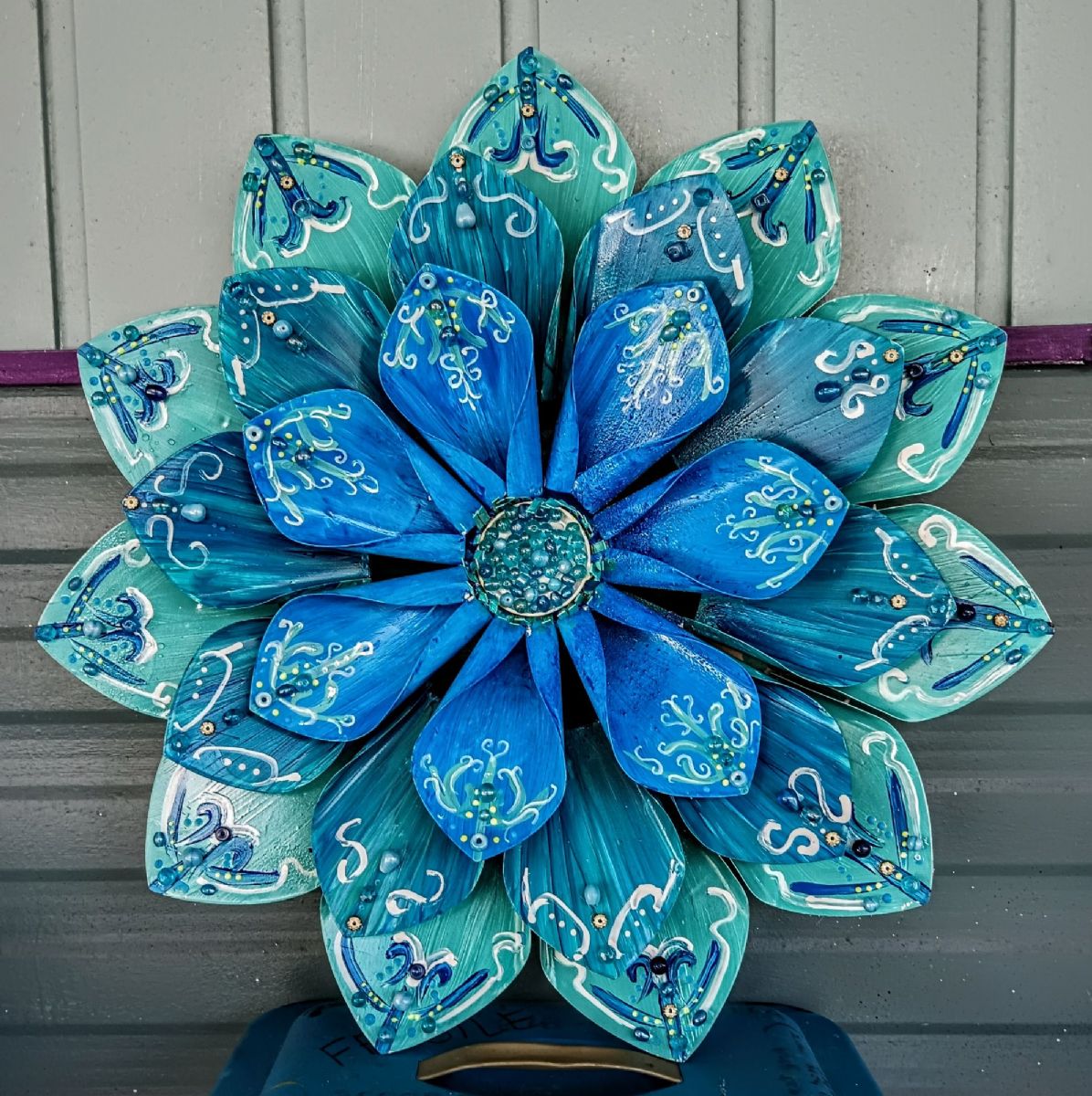 This work incorporated two of my favorite things, Dahlias and recycling art objects. First, the flowers themselves fascinate: their magnificent symmetry seems almost other-worldly and mechanical. Second, being able to repurposed and re-use items lost to time and decay;to make them sparkle and shine is a higher calling in this throw-away society. I hope this piece brings you much joy.