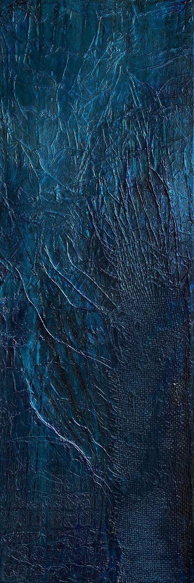 Layers of paper, burlap, and texture compound applied to the canvas. Then shades of deep, dark and moody marine blues worked over the textures. Highlighted with a silvery hue accents the work further. Created with a darkened soul ... yet the light and shimmer still bounce forth.
