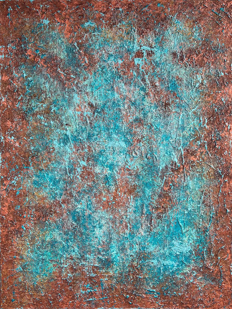 A heavily textured piece, created with layers of paper and compounds applied to the canvas. Turquois and teal tones of blue patina against the deep rust and glimmering copper of the base layer. The extreme textures emulate the crashing rain during a flash storm.