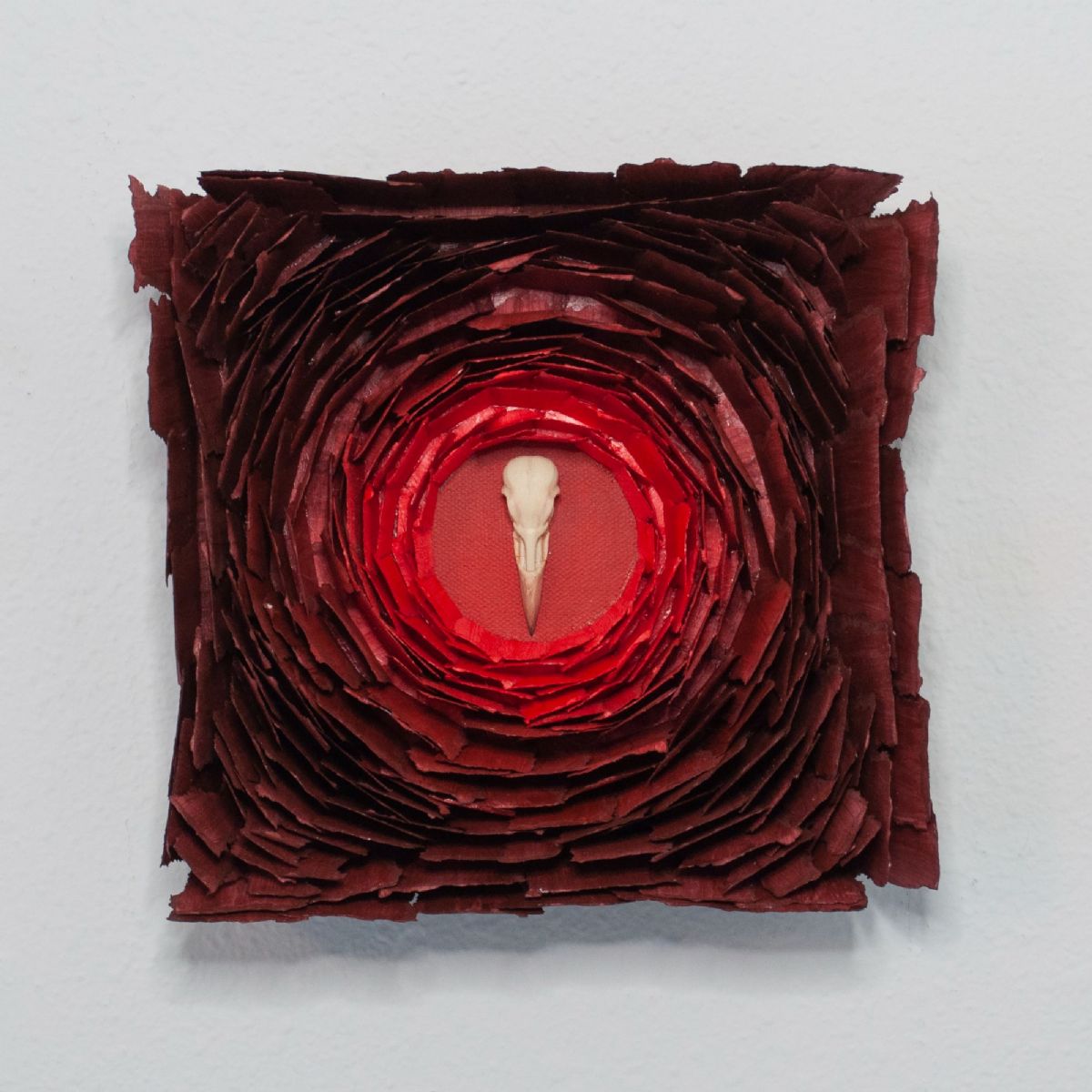 Inspired by using a natural bone as the centerpiece of another paper artwork, I opted to 3D print a raven skull and use that for another bone-focused piece.