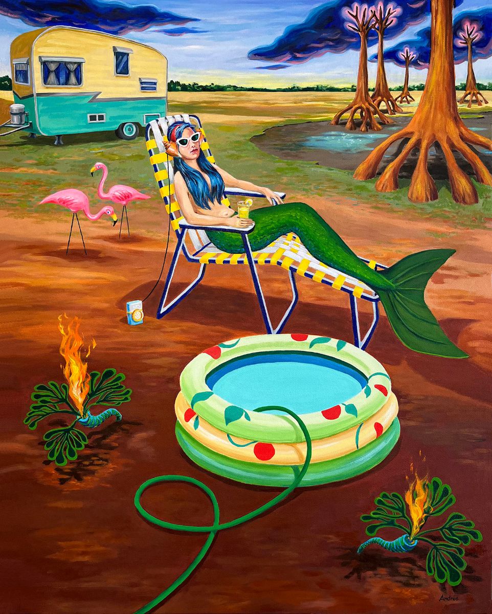 In this painting, Florida's natural splendor is on the brink of transformation, a result of unchecked environmental degradation. The mermaid can no longer reside in the once-majestic bayou, now reduced to a puddle. She is resilient however, determined not to be a creature out of place. She has her Airstream and her wading pool and is enjoying her early retirement. She is not only an ethereal beauty but an adaptable one. She gives us hope.