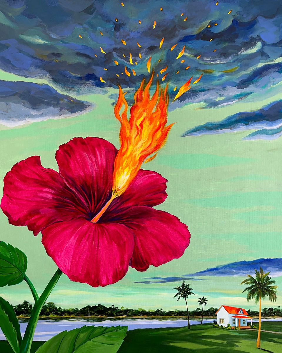 My series of paintings entitled "Flammable Florida" serve as a commentary on the delicate balance between nature's beauty and the looming threat of global warming. In the fashion of magic realism, plants protest in a fiery manner, and Florida's wild beauty serves as the perfect backdrop.