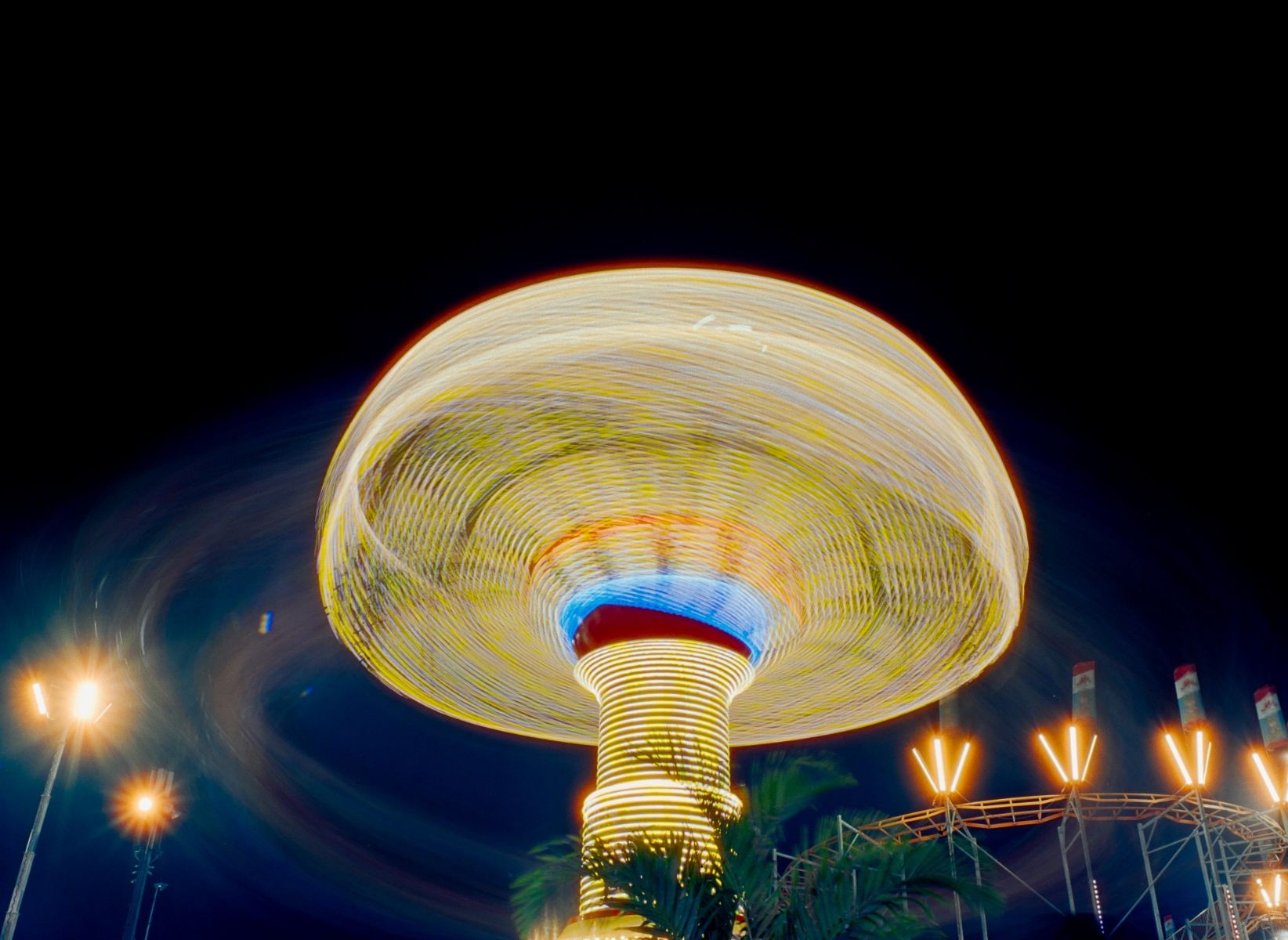 This is classic swing ride, but when you do a long exposure of the ride in operation, the swings fade away and you are left with the lighted body of the ride that reminds me of a mushroom.