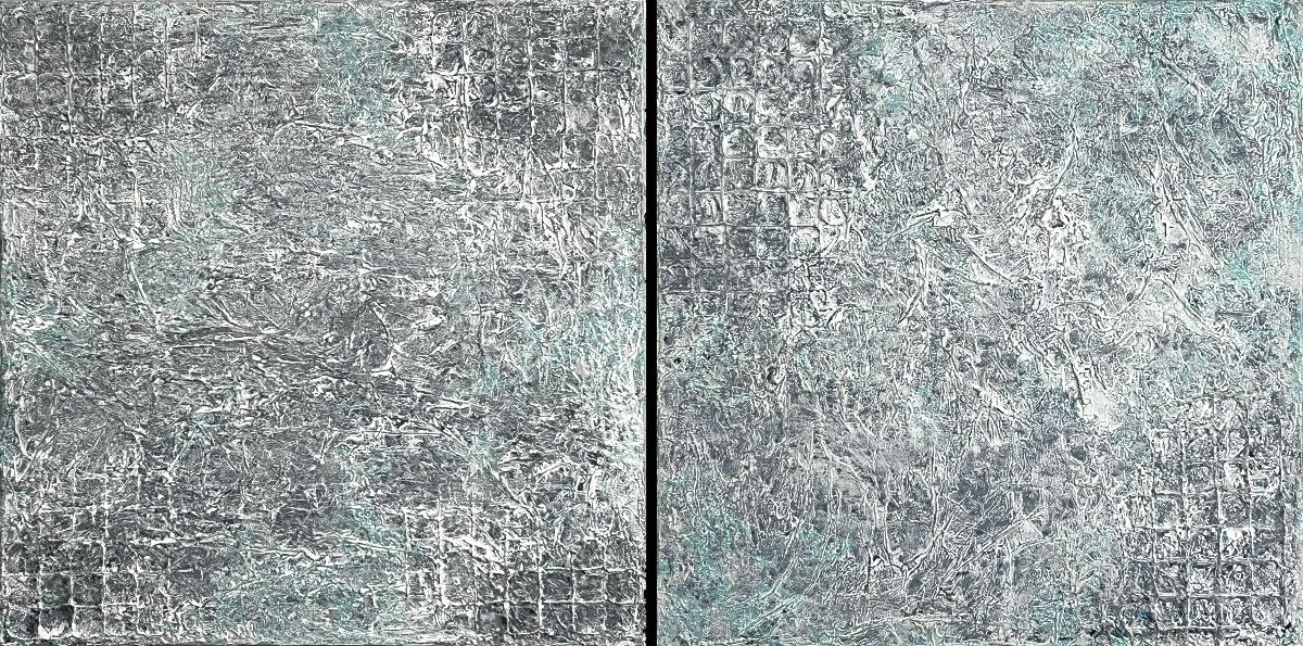 2 Heavily textured canvases of applied paper and compounds, followed by layers of acrylics.The base tones of blacks, silvers and aqua/teals are washed over by the bright white moon tones.