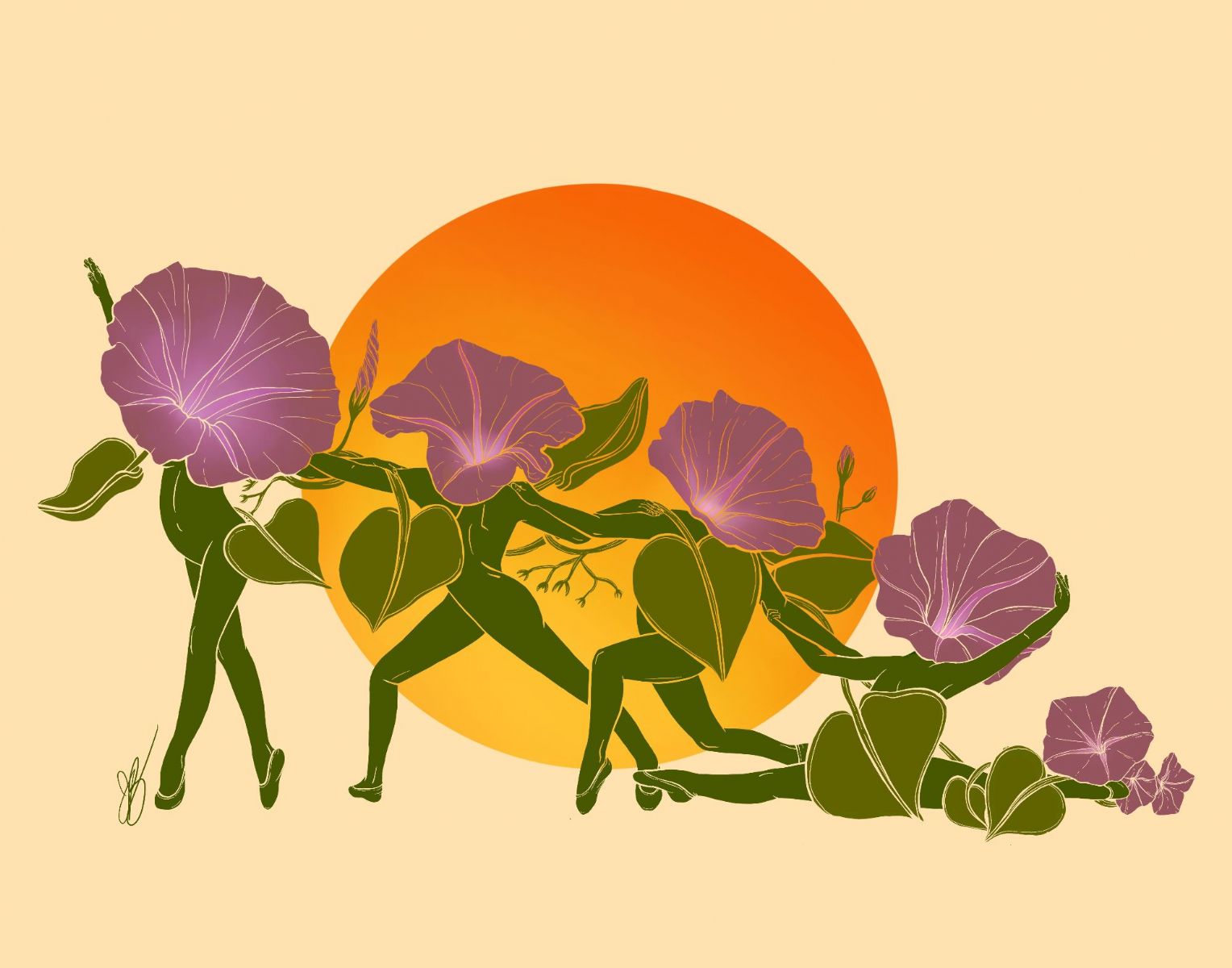 The Morning Glory's dancing vine connects blossoms like linked loved ones. One after the other, they raise each other up to reach new heights.