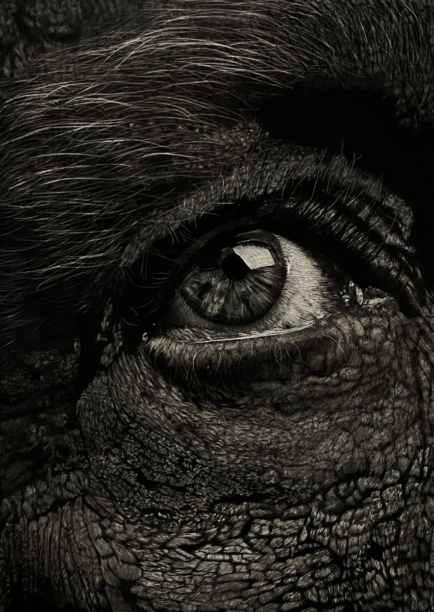 This is an original one of a kind photo-realistic scratchboard artwork of an elderly person's eye. Many have mistaken this piece for a drawing or photo. Note the extreme detail in the wrinkles and skin cells. The iris of the eye is incredibly detailed as well.