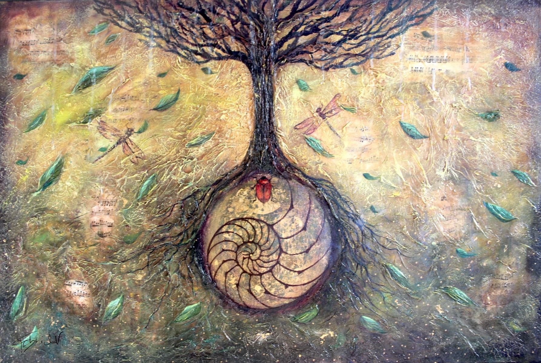 As above, so below is an ancient quote to describe the idea that what happens in a higher realm or plane of existence also happens in a lower realm. It comes from an ancient piece of writing called the Emerald Tablet of Hermes Trismegistus. The leaves in perpetual motion throughout the painting highlight the flow of energy and constant change in life.