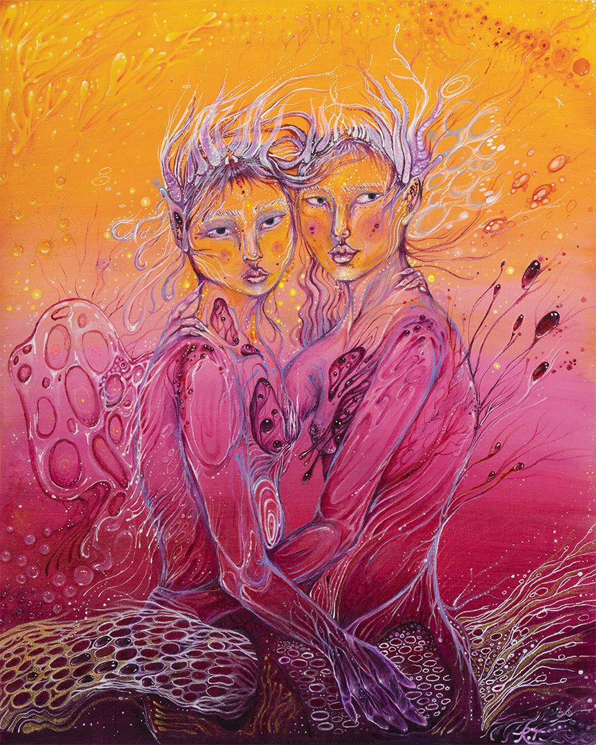 This painting represents two souls coming together & sharing their love for one another. They may be lovers, or they may share a bond akin to a close friendship, siblings, or mother & daughter. When two souls share a close relationship like this, they almost become one person while still maintaining their individuality. Although they share the same love, the way they express it is unique to the individual soul. You can see their hearts & minds intertangling as one while the “wings†that emerge from their backs take on different but still beautiful forms. Ultimately this painting is about the love, acceptance & understanding that comes from a deep connection to another human being. Hidden in this painting are iridescent, metallic & blacklight reactive accents which add a sense of celestial mystique when placed under different light sources.