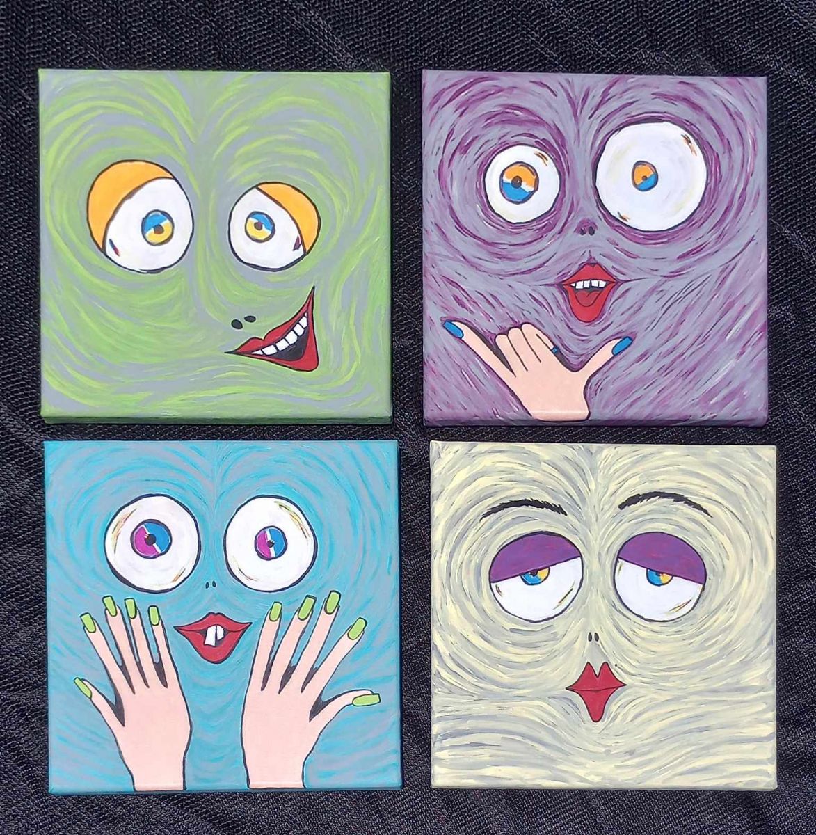 The set was inspired by an older painting of mine. In that one I was going for scary. When the gallery exhibit came to my attention I felt the lunacy of the original piece needed to be expanded on and shared.