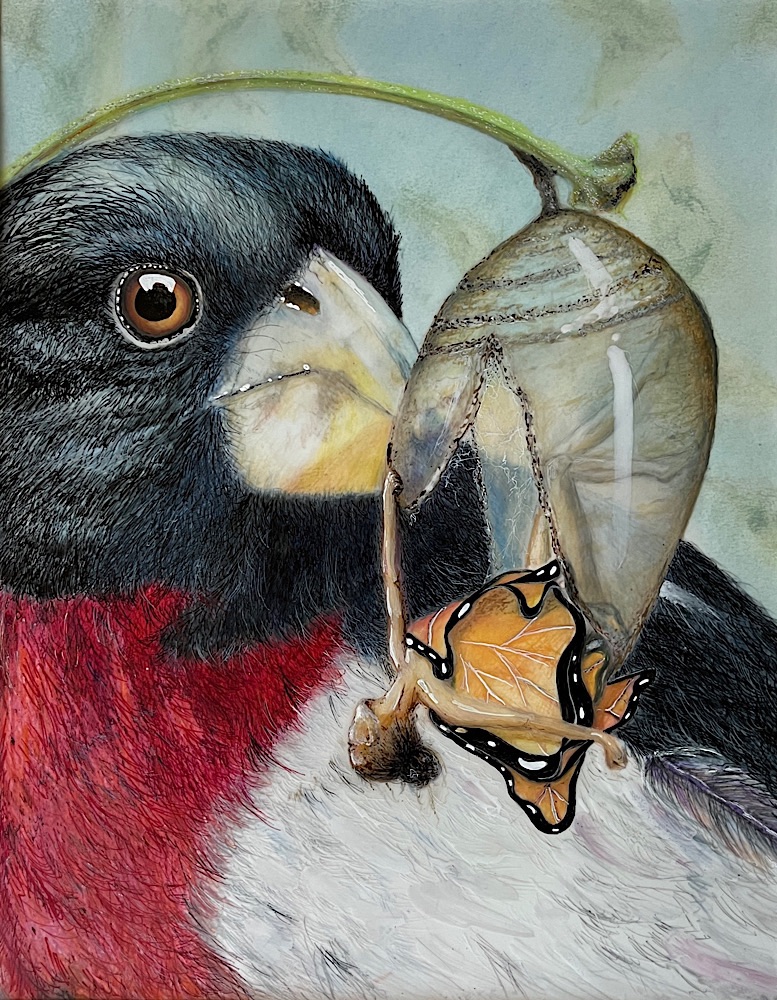 Becoming the best version of yourself is process that is both beautiful and terrifying. This piece was created for everyone who knows that fear. The "butterfly" emerges to stretch her wings only to notice she is being watched. The bird is a grosbeak, which is one of the few birds that will eat a monarch without becoming ill. The threat is real and imminent. It's time to fly!!!! It honors all that take a risk in a world full of judgment. I see you and I feel you. You are not alone.