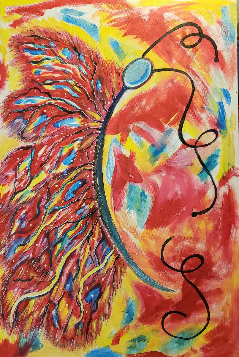 "Red Wing" is an acrylic art piece on canvas that vividly captures the beauty of a butterfly. Dominated by striking shades of red, the butterfly's wings stand out against a backdrop of bright yellow and red hues, creating a vibrant and captivating contrast. The piece embodies the essence of transformation and vitality, symbolizing the butterfly's journey of growth and renewal amidst a vibrant, colorful world.