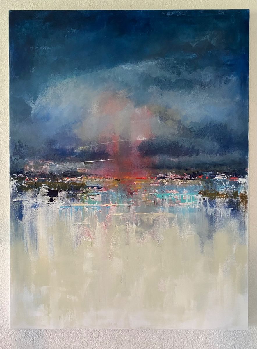 A reflection of sky on sea. The power of a setting sun. Highly textured to allow the paint to find its way. Glimmers of light and day becomes night. Magic hour.
