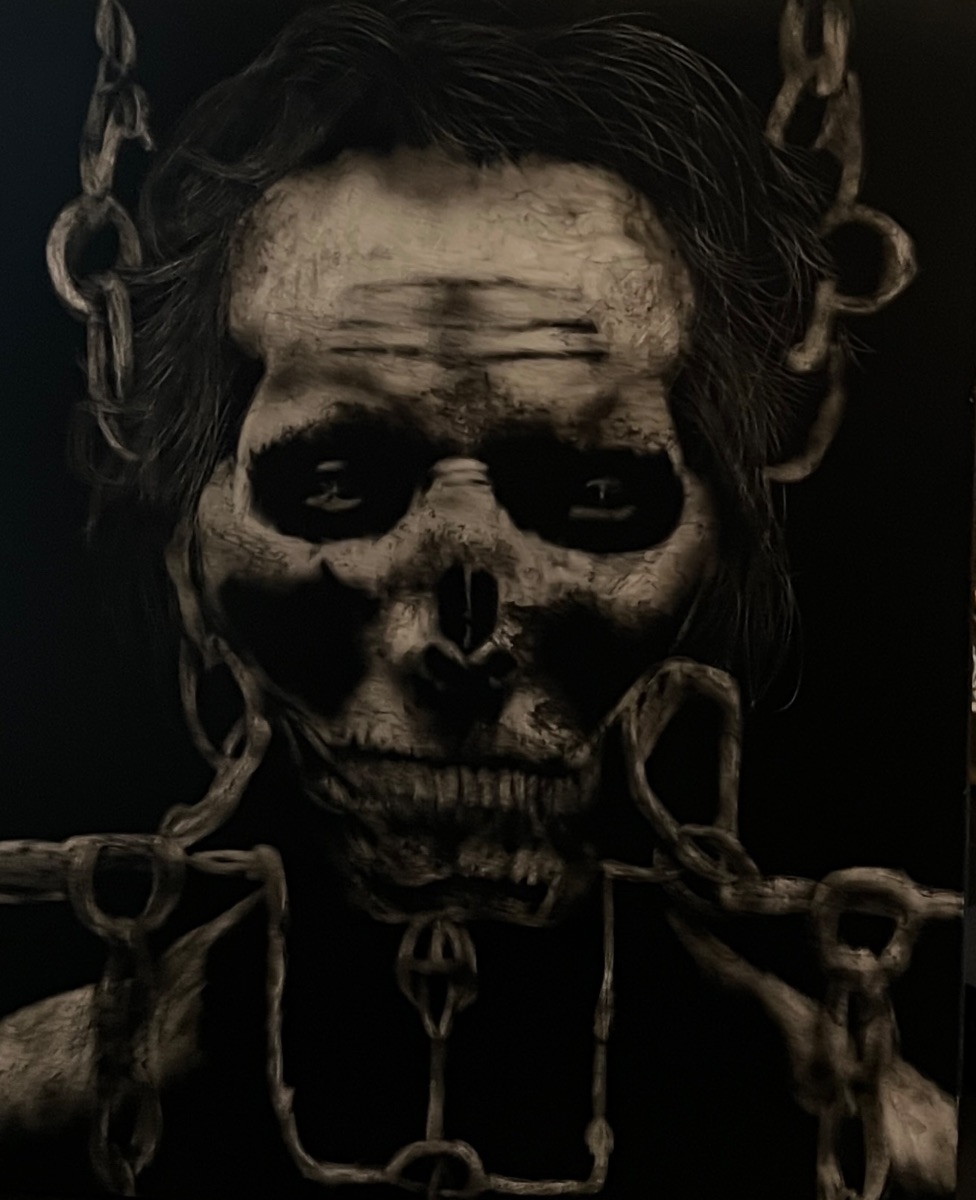 This is an original and one of a kind scratchboard artwork. I wanted to depict a prisoner who has been long forgotten. His chains have become part of his body. He has been starved as evidenced by the emaciated face.