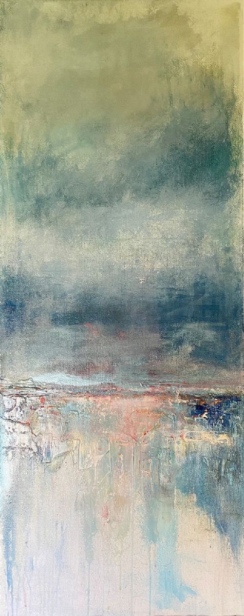Glistening and glimmering, sky and water. One reflecting the other. Unexpectedly beautiful every eve and new. I used mixed media to create a feeling of calm as night comes and hope for tomorrow.