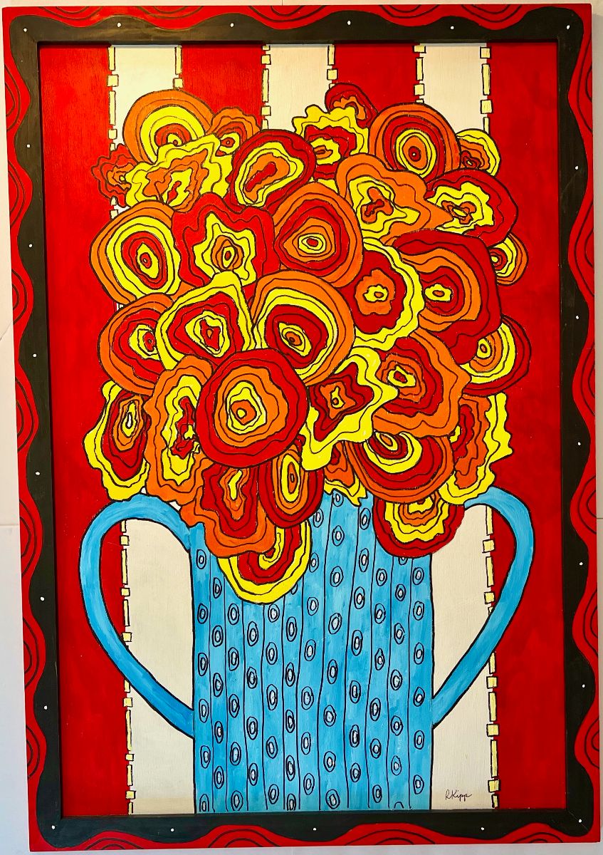 Conveying the joy, happiness and love in life is what it’s all about. Roger wants his bright colors and happy flowers to make you smile every time you see his work. His paintings encompass enchantment and jubilance sprinkled with whimsy and a bit of sophistication. He brings a simplicity and a playful lightheartedness to his work.