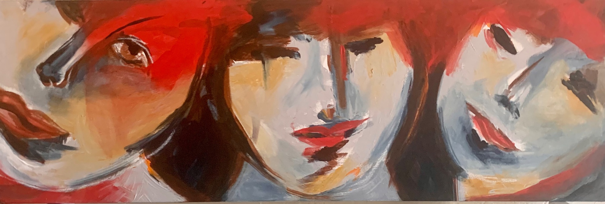 The strong use of color and form in this piece draws you in. There is an emotional intensity that comes through the bold palette and the expressive brushstrokes, suggesting a range of feelings from passion to contemplation. The abstract quality invites the viewer to engage in and interpret the piece on a personal level allowing for a unique connection with the artworks and the many facets of women.