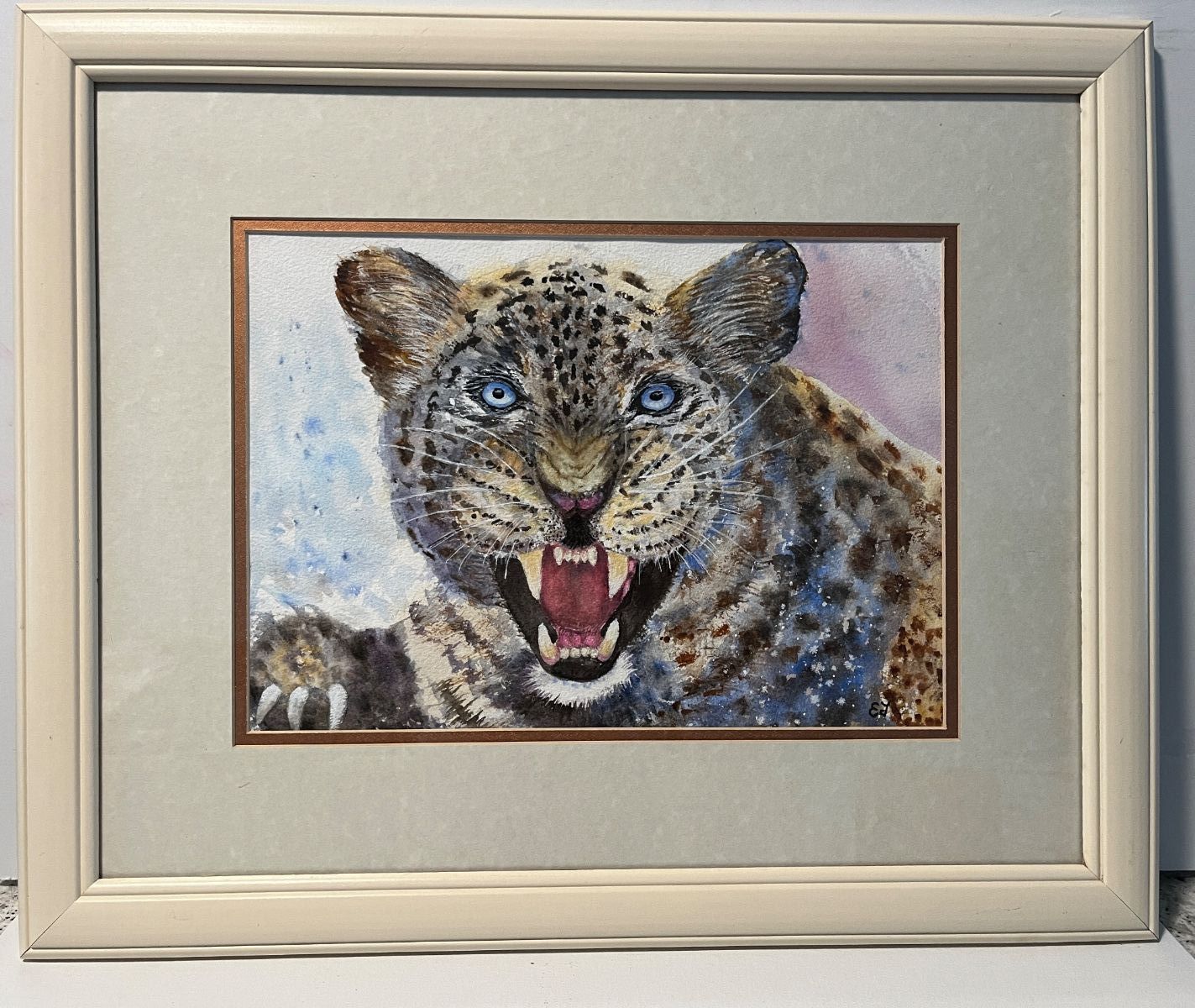 In this watercolor artwork, a snow leopard shows his powerful presence. The open jaws reveal sharp fangs, and its eyes blaze with intensity. I wanted to capture the tension between vulnerability and ferocity—the moment before the leap, the primal instinct to protect or conquer. The soft, layered strokes of watercolor evoke the leopard’s fur, hinting at its wild habitat. In “Fierce Majesty” I invite viewers to witness the untamed spirit of this elusive predator, frozen in a fleeting moment of raw emotion.