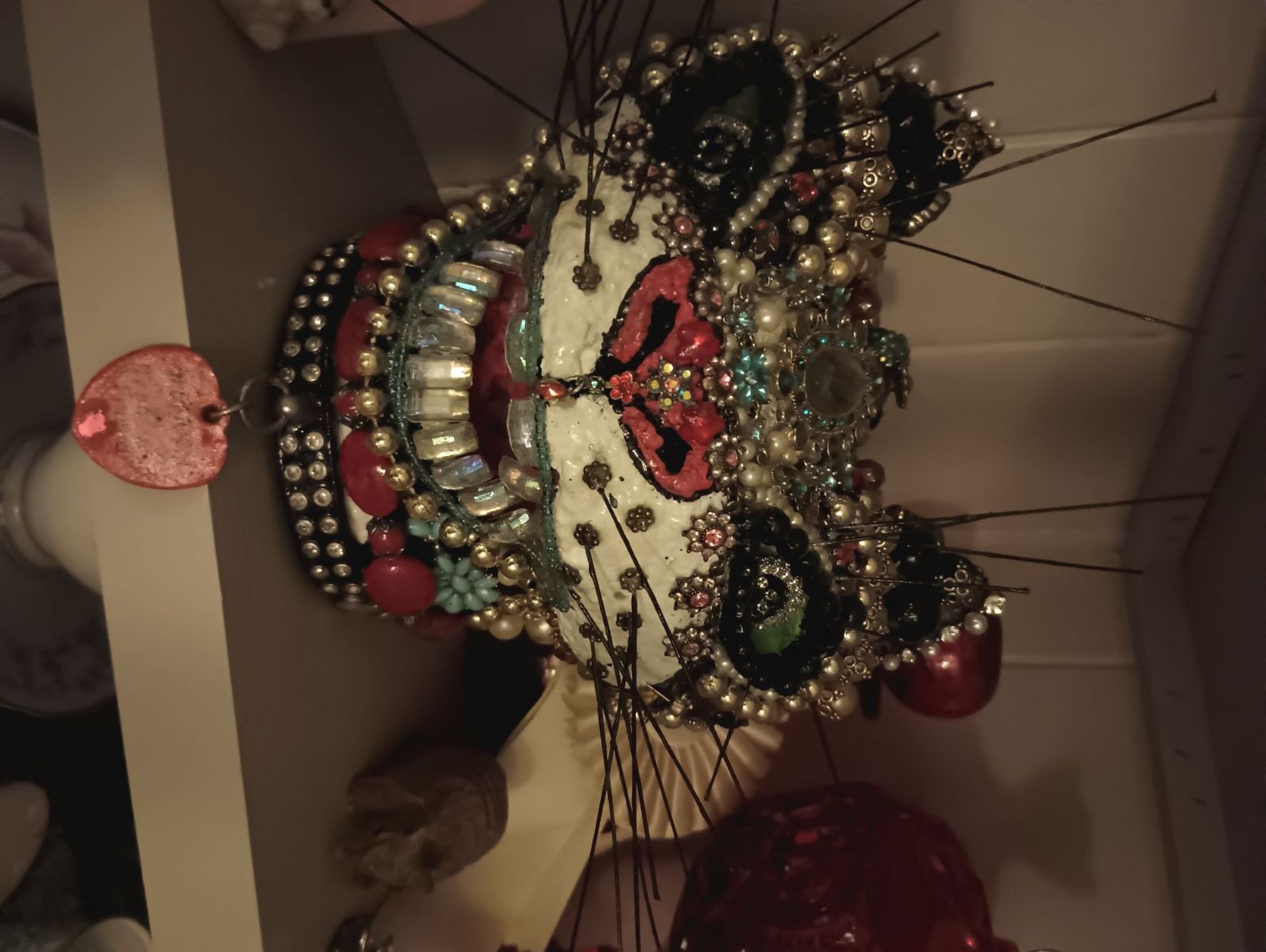 This piece was originally begun in honor of my Mom's dear cat Munson, who stayed at her bedside day and night while she battles cancer. It is made of plaster, sculpted and painted, then embellished with many treasured hand-me-down costume and semi-precious jewelry. My Mom was my treasure, and Munson was her "Treasured Friend".