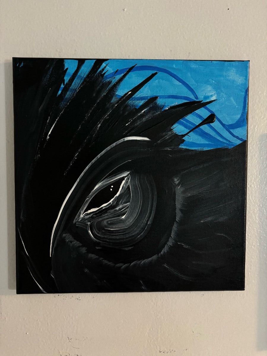 A representation of the night spirits I see in my dreams. She is always there watching and protecting. Her eyes sharper than a knife and she appears and disappears in the night like magic. She is the perfect guardian. This acrylic painting is 12"x12".