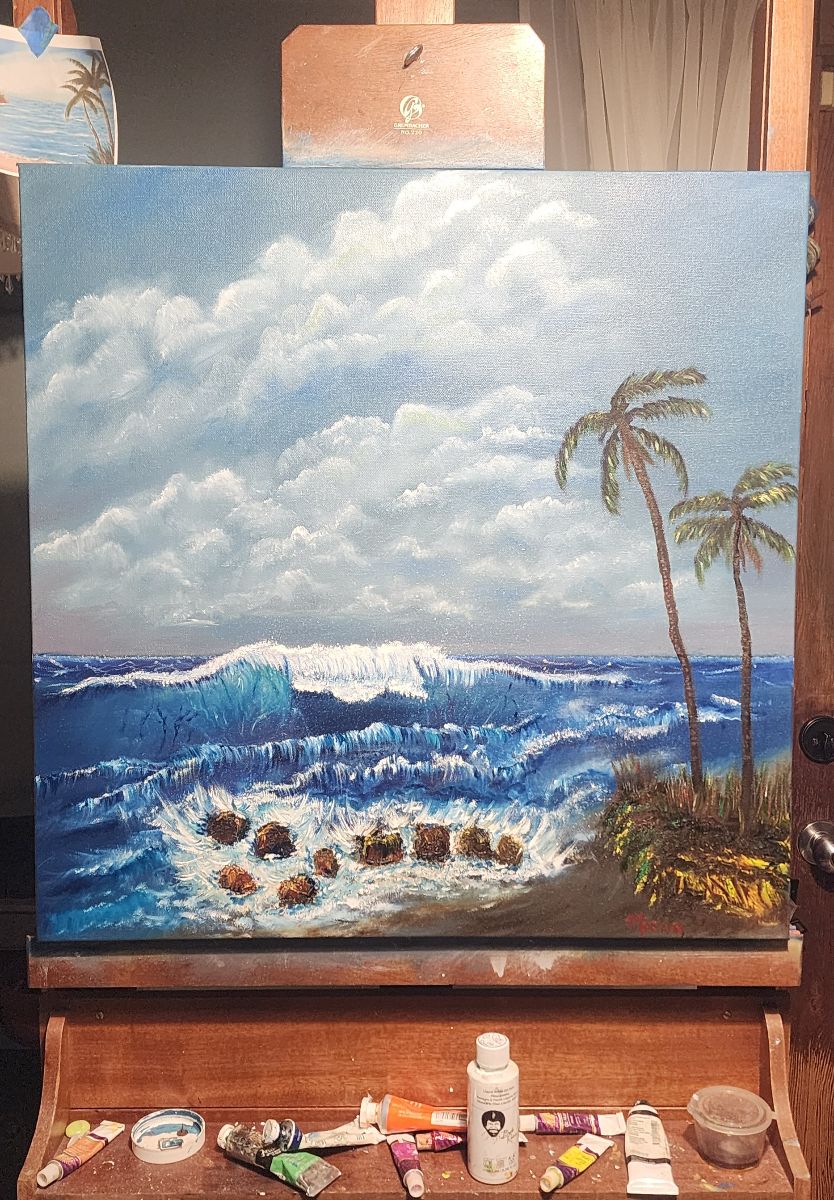 This oil painting is a beautiful piece with stormy waves. Was inspired by the stong "Stormy"