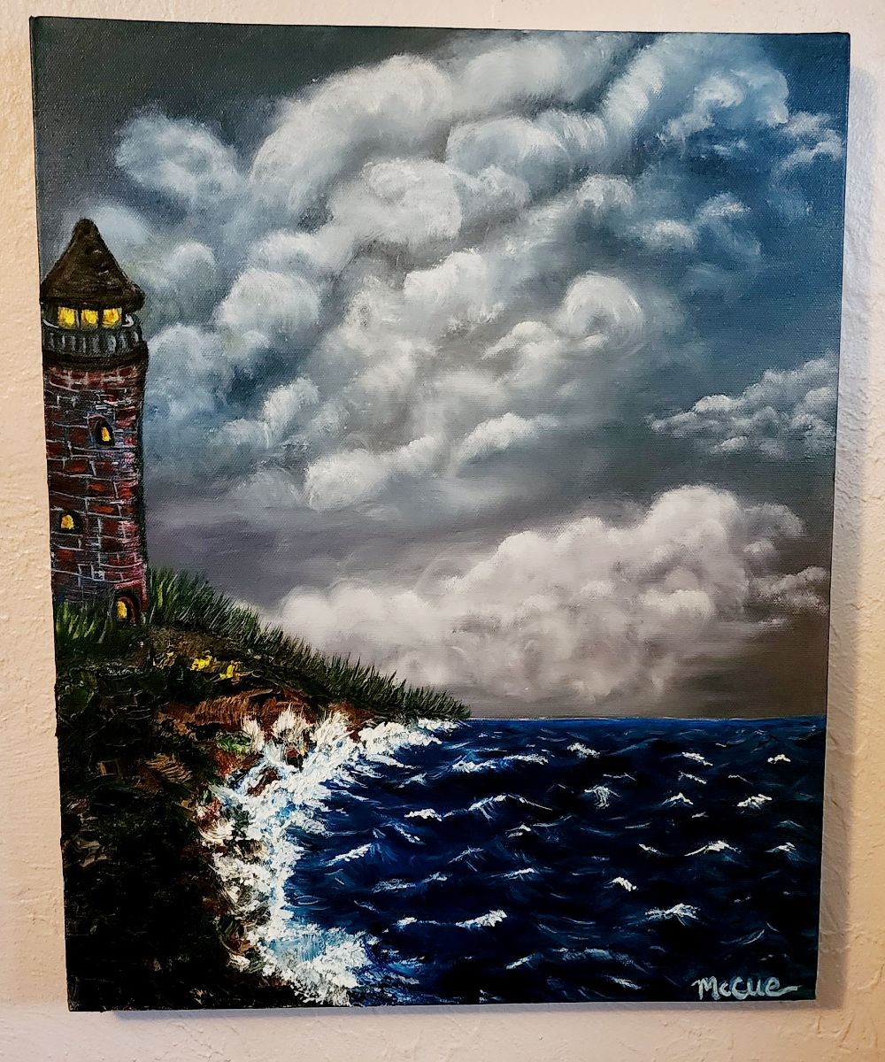 This stormy depiction of the lighthouse standing alone strong while the waves hit the shore.