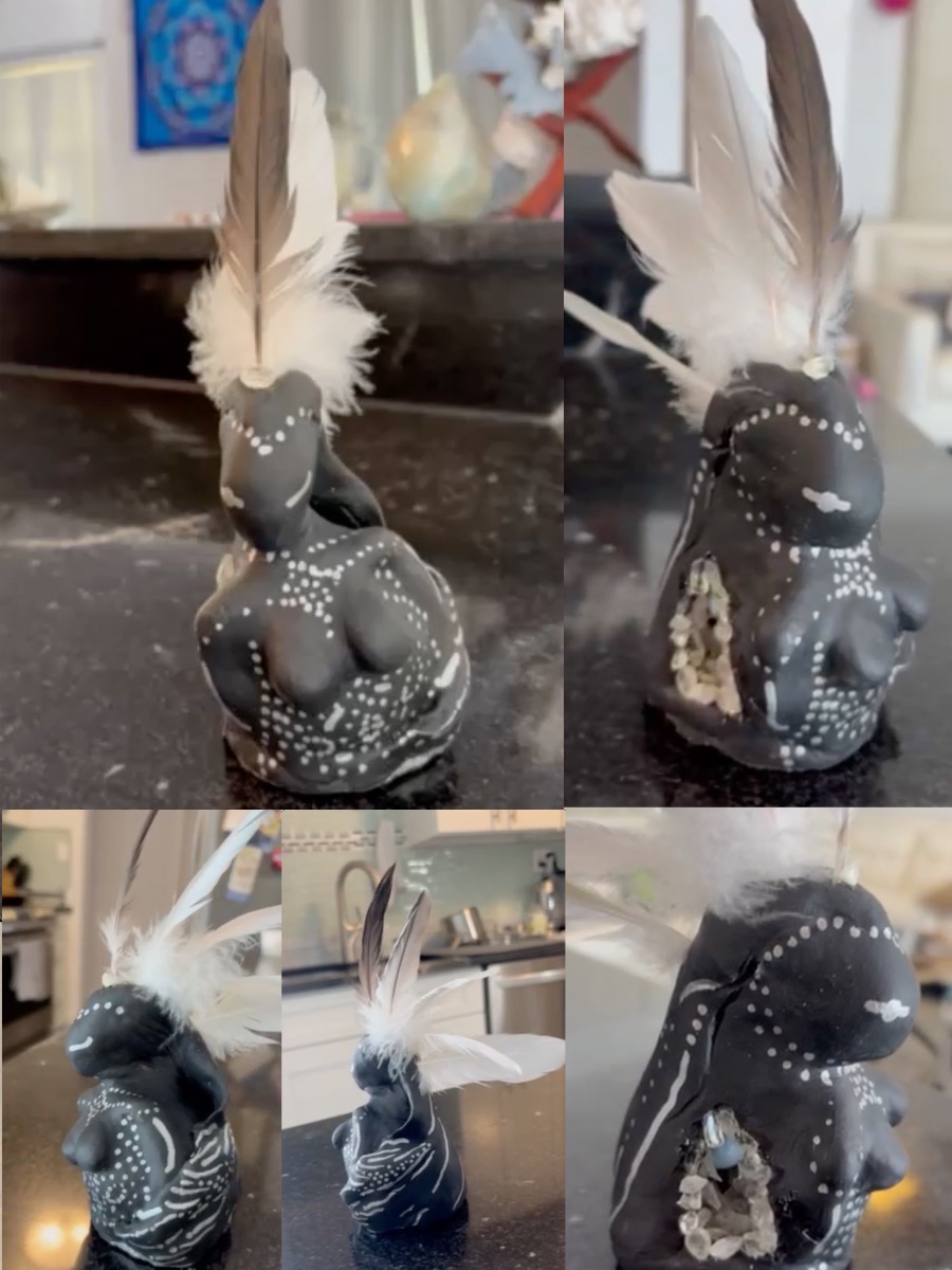The universe began in darkness. Creation starts in nothingness. This goddess represents the beginning, the start of something new and magnificent. This sculpture was created with modeling clay, quartz crystal chips, Opalite, acrylic, 3 cockatoo feathers, 1 racing pigeon feather and 1 Anhinga feather. *All feathers ethically sourced!