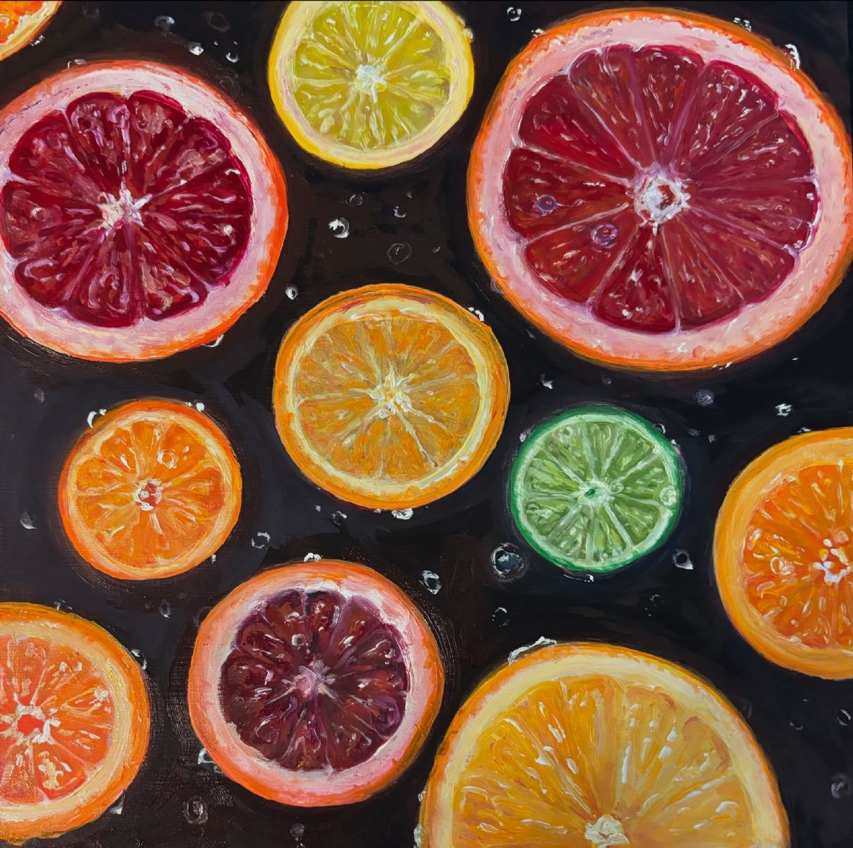 Super juicy is a simple and yet dynamic piece. I chose a variety of different citrus slices. The deep ruby of the blood oranges contrasts with the bright orange. The lemons and the limes add variation in size and color rounding out this simple piece. The slices are dripping with juice and the water droplets on the dark background make the fruit appear to be floating in water. It feels refreshing!