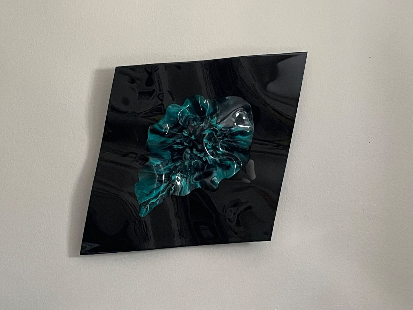 I first created the center piece of this painting, it reminded me of a blue topaz precious stone. I then decided that any precious stone deserves to be shown on wavy black silk. This painting can also be hung like a Diamond shape.