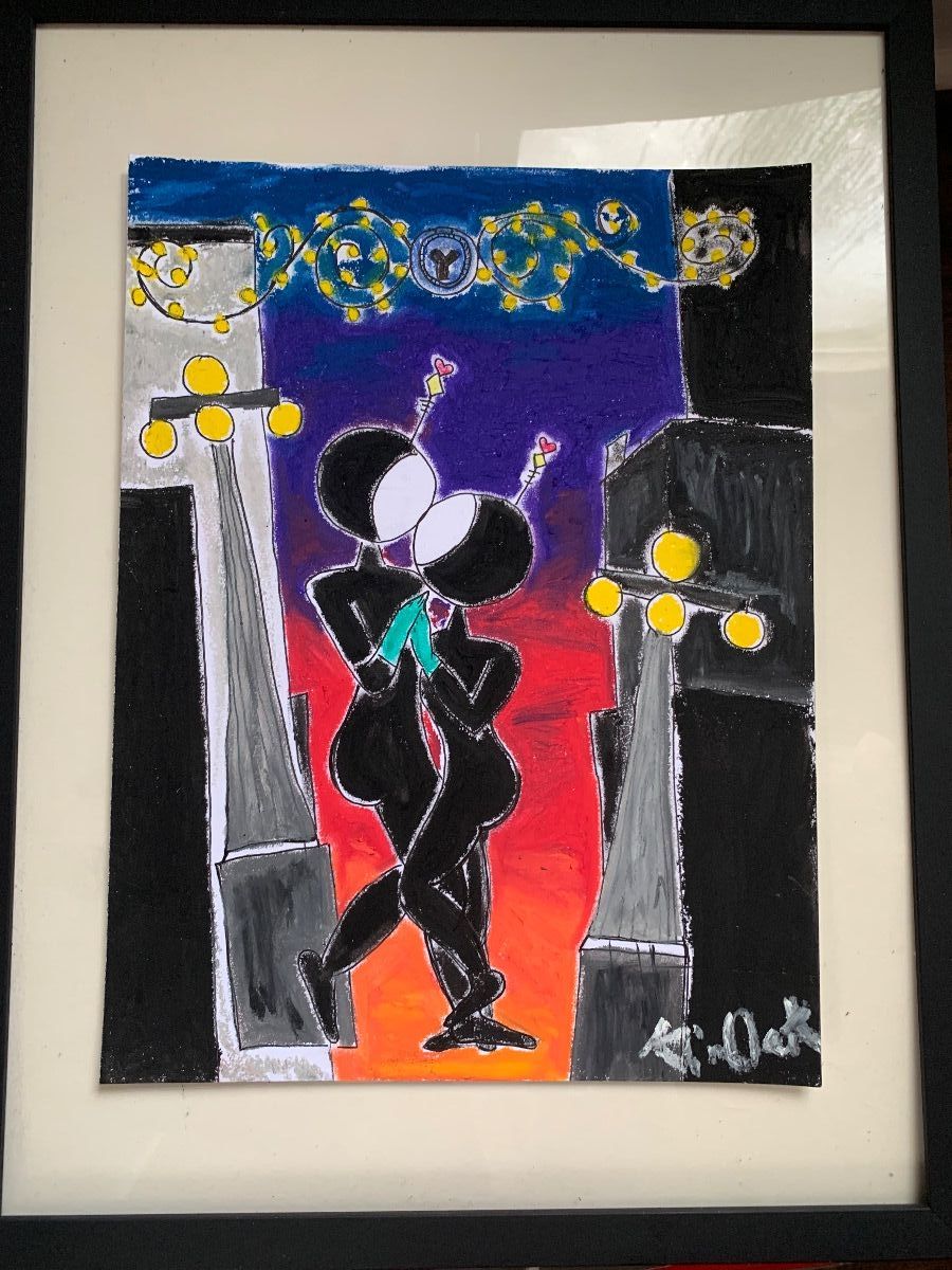 This piece is an illustration in oil pastel 9x12 in a 12x16 black and white matted frame.