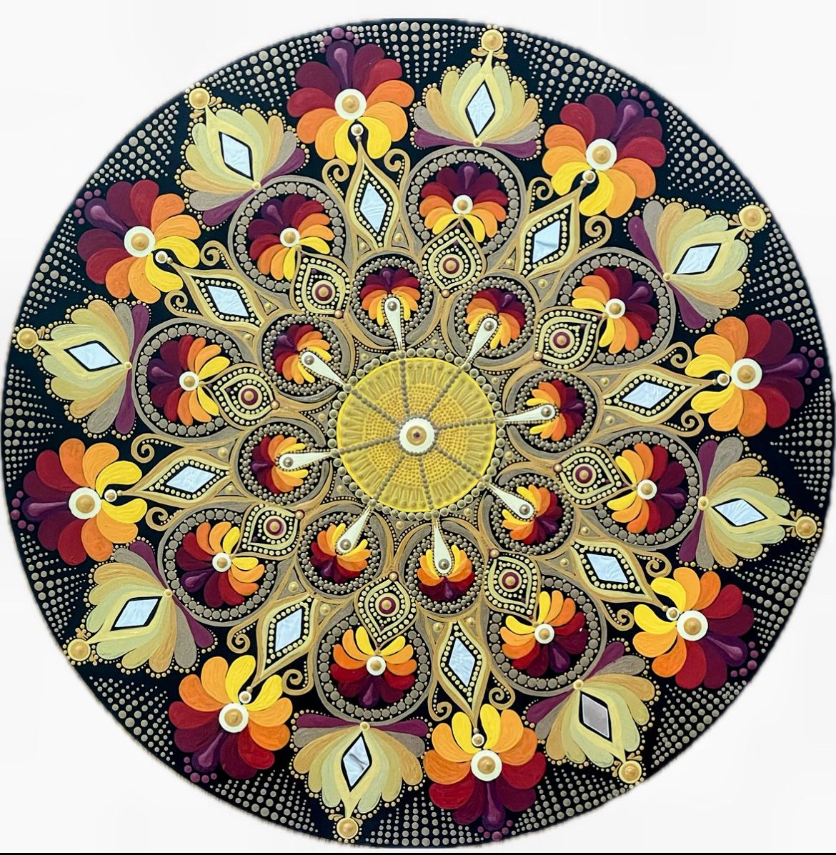 Golden Passion was named so because its colors inspire. Painted with acrylics on a 15.8" wooden circle. Dots, swooshes and small mirrors.