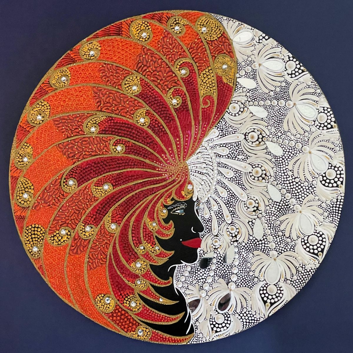 Painted with acrylics on a wooden circle.